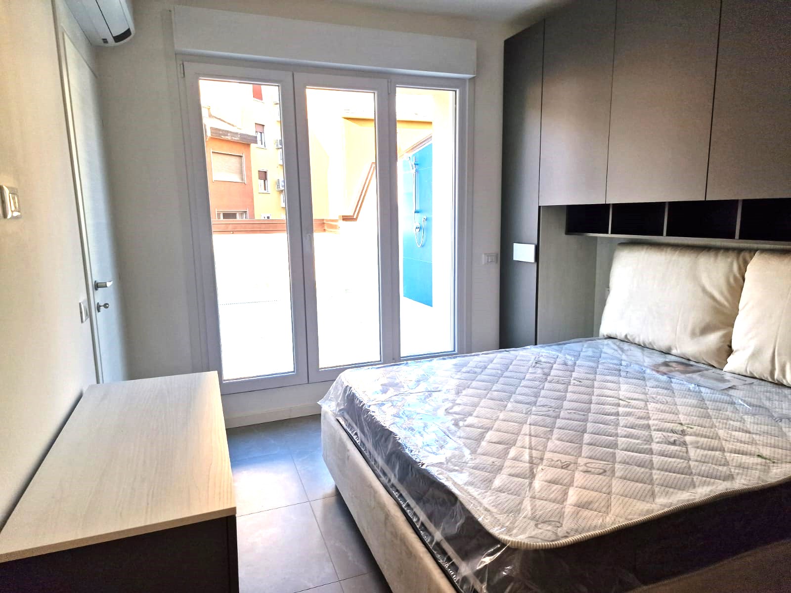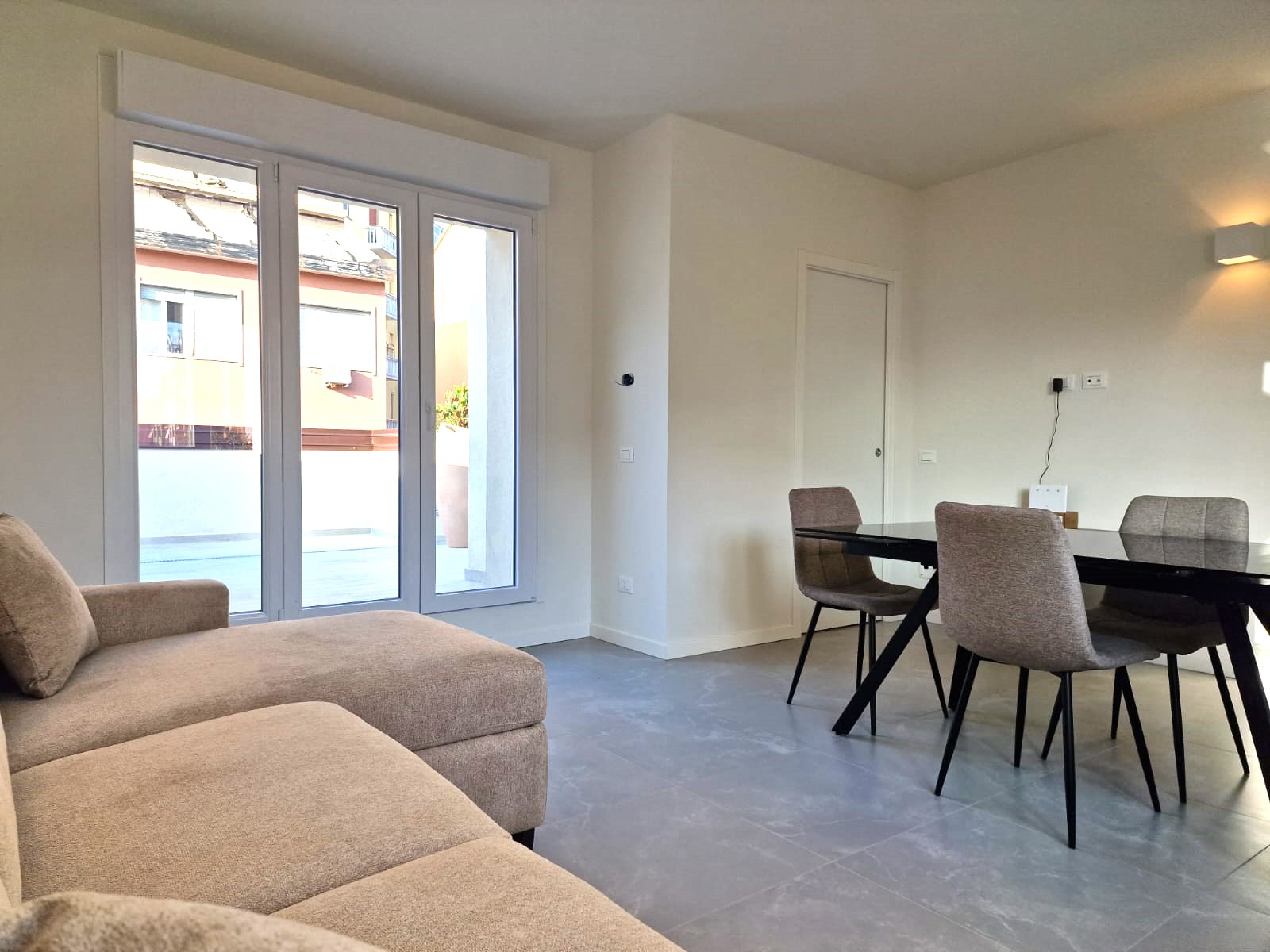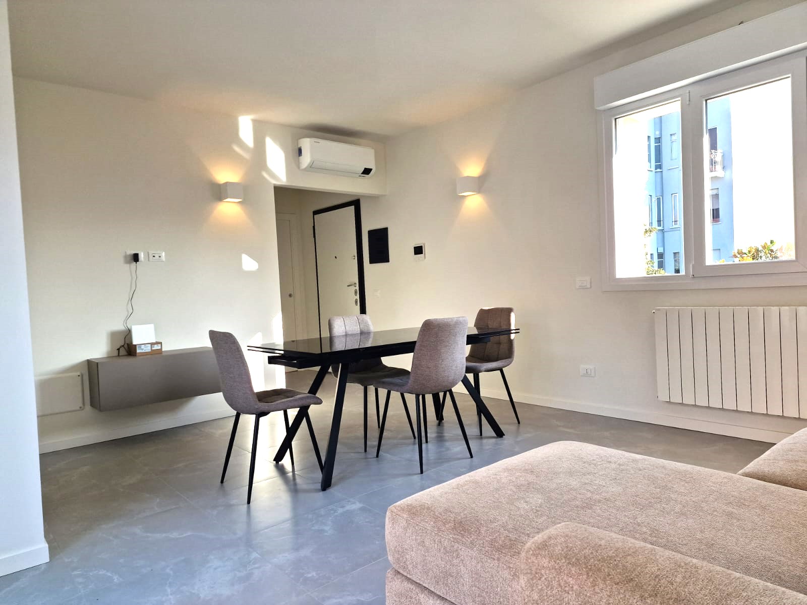 Composto da: ingresso, soggiorno con accesso al terrazzo arredato con divano e grande tavolo con 4 sedie, cucinotto separato completo di tutti gli elettrodomestici, lavastoviglie e fuochi ad induzione, camera matrimoniale con entrata diretta al terrazzo e bagno con doppio accesso e doccia in cristallo. Ristrutturato ed arredato a nuovo con arredi su misura.